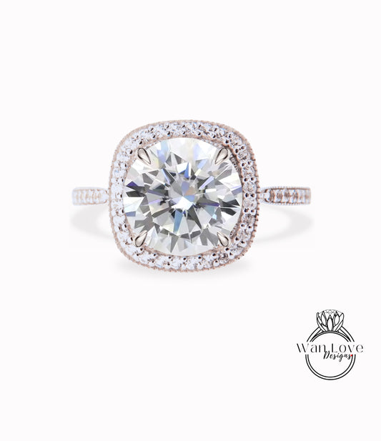 Diamond Engagement Ring white gold band vintage Cushion milgrain halo ring round Lab Diamond prong art deco Bridal Anniversary Promise ring