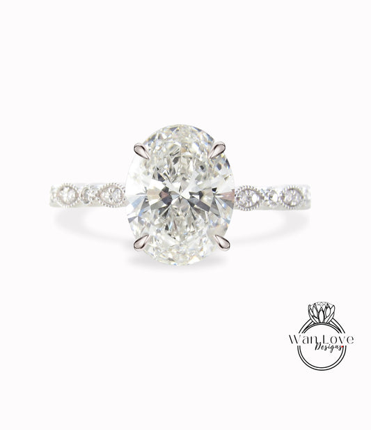 Vintage diamond engagement ring oval cut ring 14K/18K white gold milgrain lab diamond prong ring wedding Bridal promise art deco Anniversary