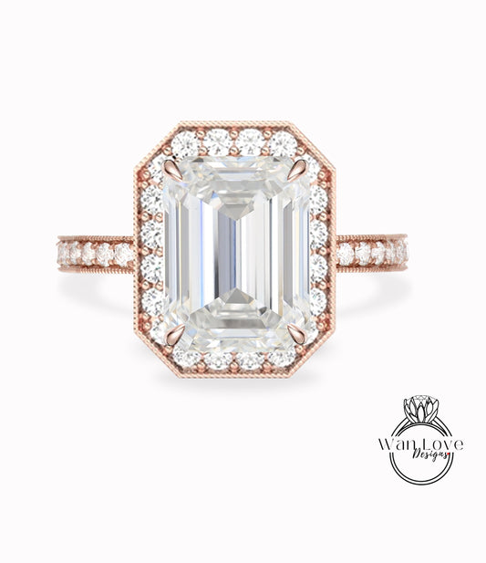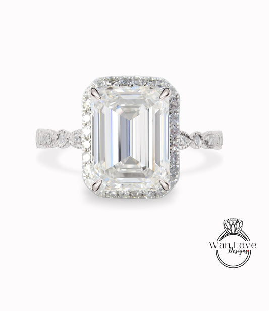 Diamond Halo Scalloped Milgrain Shank band Ring Radiant Engagement Ring Art Deco Emerald Gray Halo Ring wedding anniversary bridal promise ring