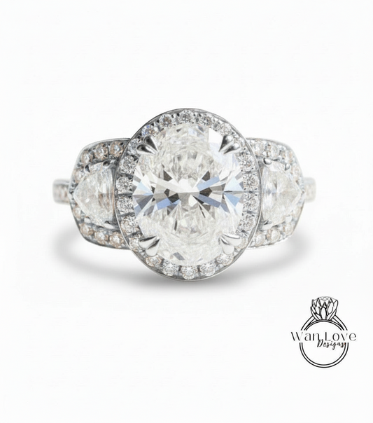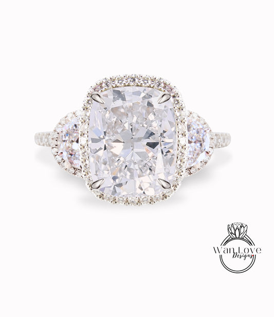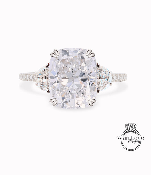 Diamond Engagement Ring Elongated Cushion Half Moon 3 Gem Stone 14k 18k White Yellow Rose Gold, Platinum, Custom Genuine IGI Lab Created Diamond Ring