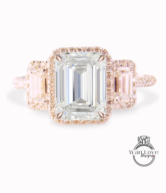 Diamond Emerald cut halo engagement ring half moon rose gold art deco IGI Certified diamond three stone triple halo ring wedding Bridal ring Anniversary gift