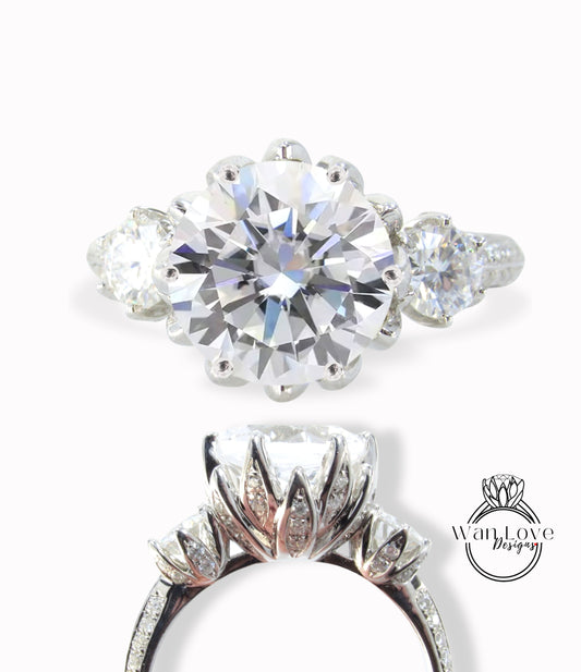 Diamond Lotus Flower Three Stone Engagement Ring, 3 gem stone Lotus Flower ring, Bridal Wedding Ring, Anniversary gift for her, Certified Diamond Engagement Ring
