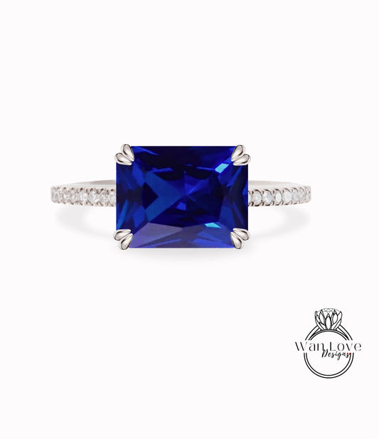 Blue Sapphire & Diamond East West Double prong Engagement Ring, Emerald cut Pink Sapphire ring, Custom, Wedding Anniversary Gift ring