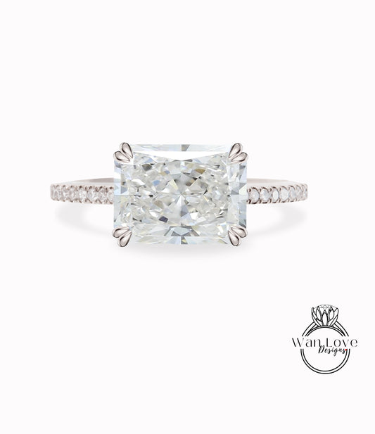East West Diamond Side halo Radiant engagement ring Tapered plain band Lab Diamond ring rose gold prong ring Art deco Solitaire wedding bridal Anniversary promise