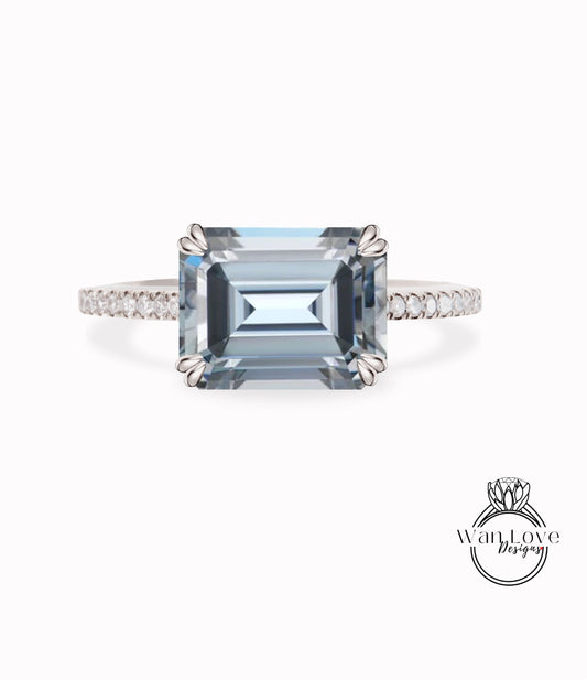 Aquamarine Blue Spinel & Diamond East West Double prong Engagement Ring, Emerald cut Light Blue Spinel ring, Custom, Wedding Anniversary Gift ring