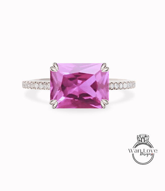 Pink Sapphire & Diamond East West Double prong Engagement Ring, Emerald cut Pink Sapphire ring, Custom, Wedding Anniversary Gift ring