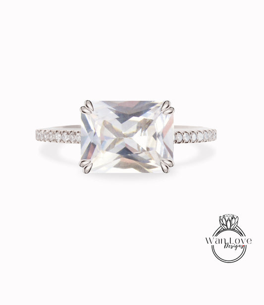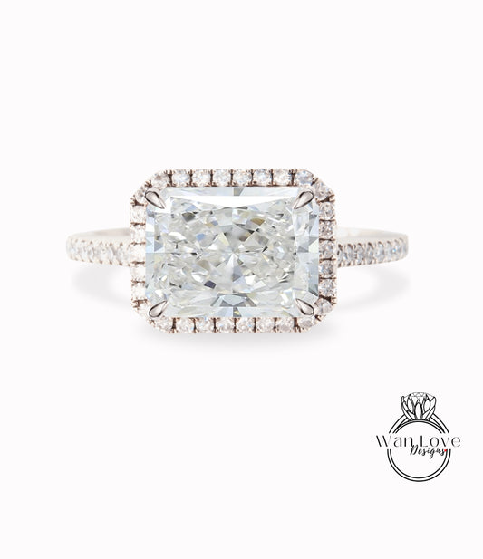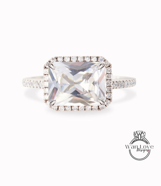 White Sapphire Diamond Halo East West Emerald Radiant Engagement Ring, 14k 18k White Yellow Rose Gold-Platinum-Custom-Wedding