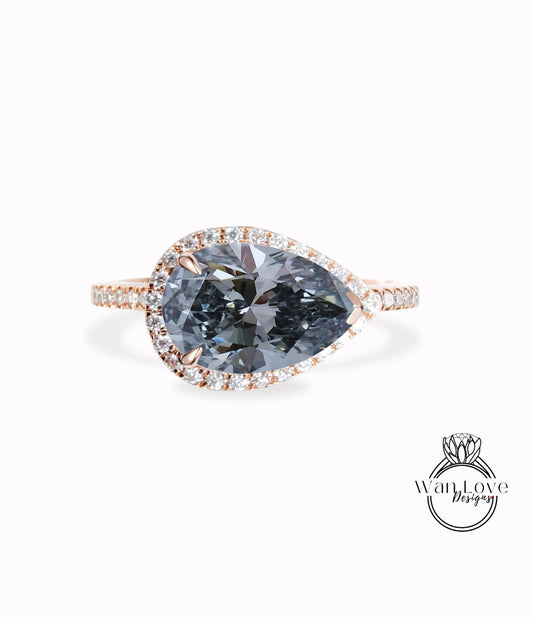 East West Pear Halo Engagement Ring, Antique Gray Moissanite engagement ring, diamond halo pear cut ring, vintage halo Ring, Unique Halo Ring