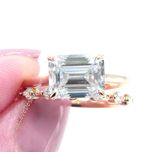 Emerald cut White Sapphire engagement ring vintage Unique Bridal set East West rose gold engagement ring women Diamond Station Promise gift