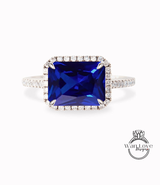 Emerald cut Blue Sapphire engagement ring gold Unique east west Halo engagement ring women almost eternity diamond wedding Anniversary gift