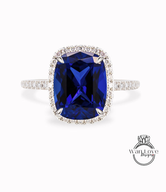Blue Sapphire Elongated Cushion & Diamond halo engagement ring gold vintage engagement ring women Half eternity wedding Bridal Anniversary Gift
