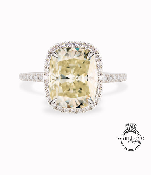 Yellow Sapphire Elongated Cushion & Diamond halo engagement ring gold vintage engagement ring women Half eternity wedding Bridal Anniversary Gift