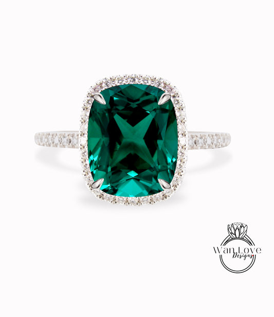 Emerald Elongated Cushion & Diamond halo engagement ring gold vintage engagement ring women Half eternity wedding Bridal Anniversary Gift