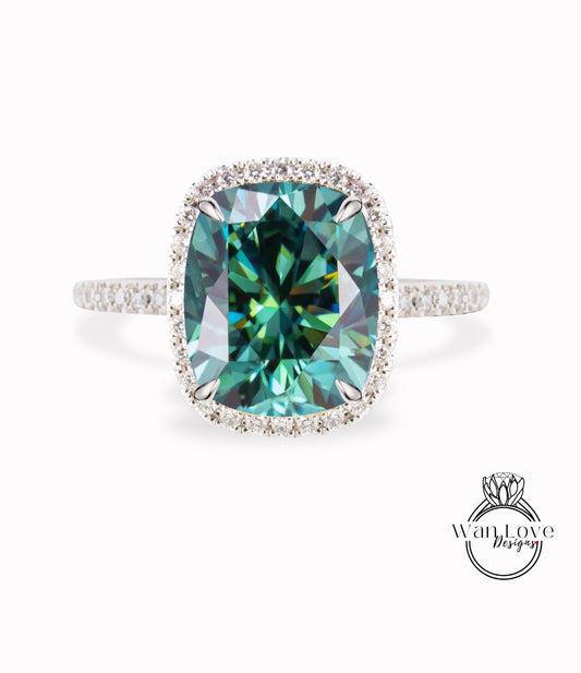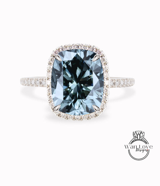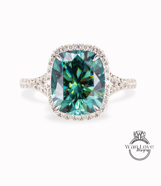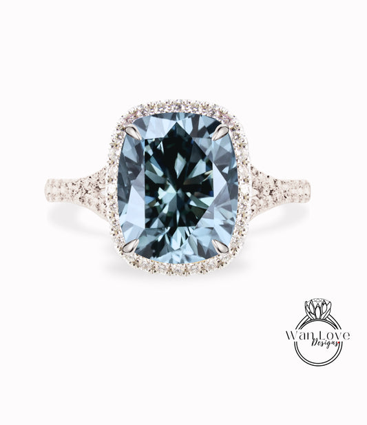Blue Moissanite & Diamond Elongated Cushion Halo Split Shank Ring Engagement Ring Art Deco split band Halo Ring Wedding bridal ring Anniversary gift