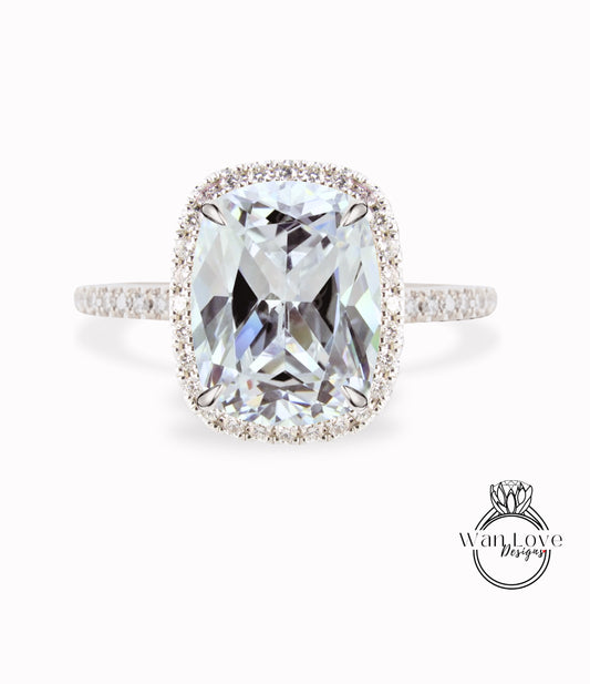 White Sapphire Elongated Cushion & Diamond halo engagement ring gold vintage engagement ring women Half eternity wedding Bridal Anniversary Gift