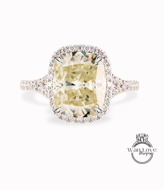Champagne Moissanite & Diamond Elongated Cushion Halo Split Shank Ring Engagement Ring Art Deco split band Halo Ring Wedding bridal ring Anniversary gift