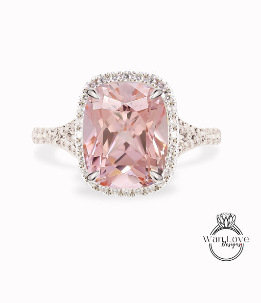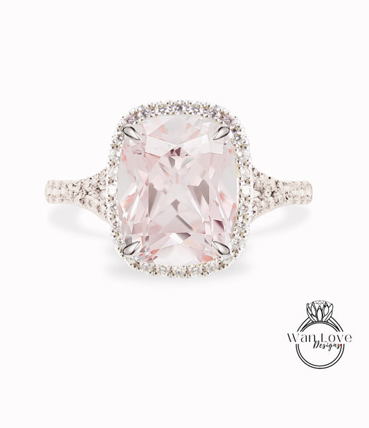 Light Pink Sapphire & Diamond Elongated Cushion Halo Split Shank Ring Engagement Ring Art Deco split band Halo Ring Wedding bridal ring Anniversary gift