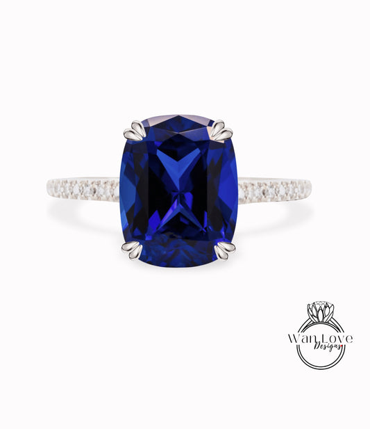Blue Sapphire & Diamonds Elongated Cushion cut Double prongs Engagement ring gold vintage engagement ring women Half eternity wedding Bridal Aniversary Gift