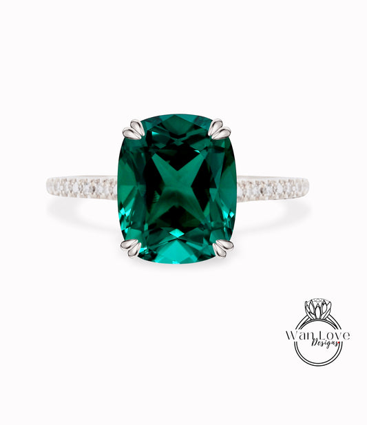 Emerald & Diamonds Elongated Cushion Double Prong Solitaire Engagement Ring Half Eternity Custom Bridal Wedding Anniversary Gift 14kt 18kt Gold, Platinum