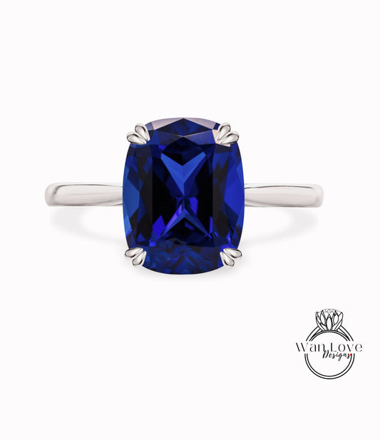 Blue Sapphire Elongated Cushion Cathedral Solitaire Engagement Ring, Custom-14k 18k White Yellow Rose gold-Platinum, Bridal Wedding Ring Anniversary Gift