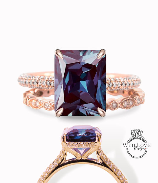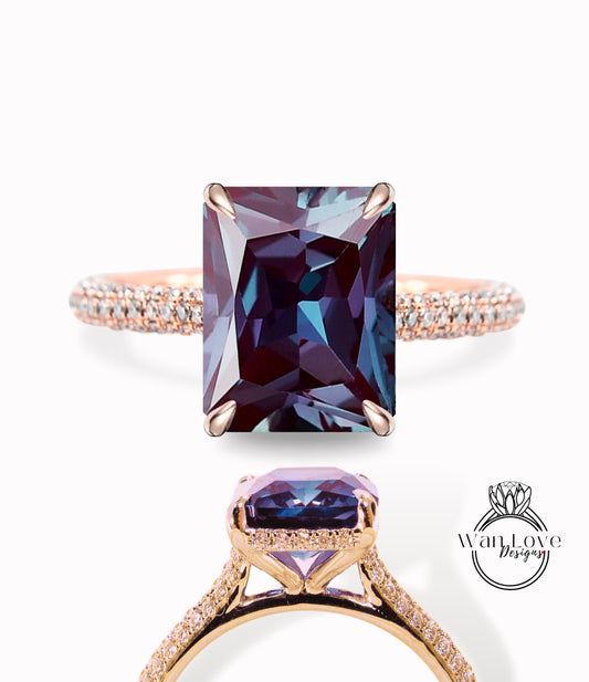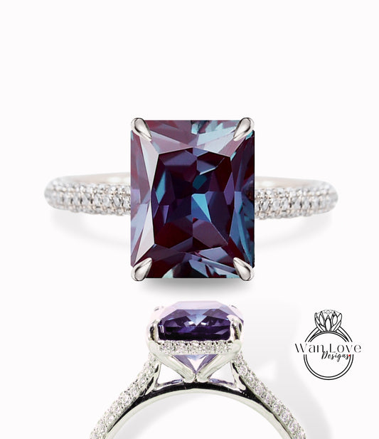 Alexandrite & Diamond Emerald cut 3 sided Band Celebrity Style Engagement Ring Custom 14k 18k White Yellow Rose Gold Platinum Wedding Anniversary Bridal Gift