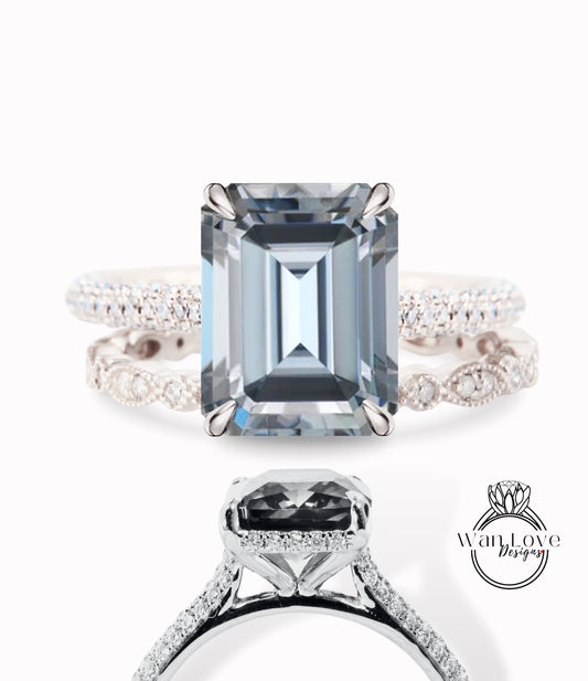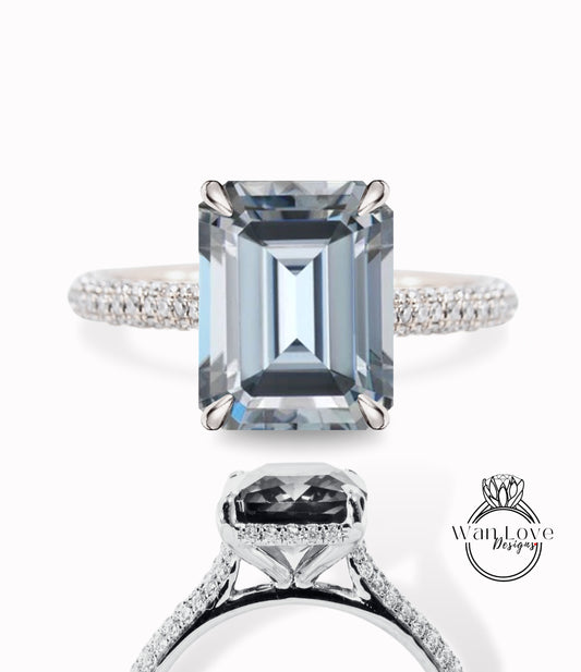 Gray Moissanite & Diamond Emerald cut 3 sided Band Celebrity Style Engagement Ring Custom 14k 18k White Yellow Rose Gold Platinum Wedding Anniversary Bridal Gift