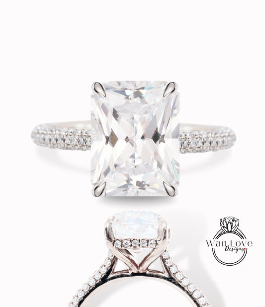White Sapphire & Diamond Emerald cut 3 sided Band Celebrity Style Engagement Ring Custom 14k 18k White Yellow Rose Gold Platinum Wedding Anniversary Bridal Gift