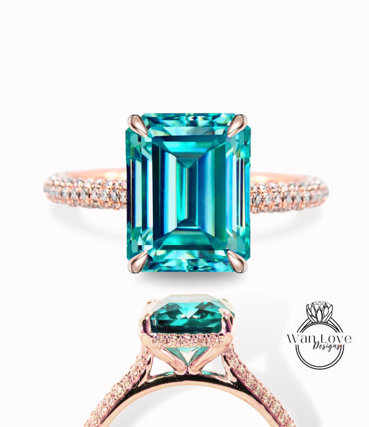 Teal Blue Green Moissanite & Diamond Emerald cut 3 sided Band Celebrity Style Engagement Ring Custom 14k 18k White Yellow Rose Gold Platinum Wedding Anniversary Bridal Gift