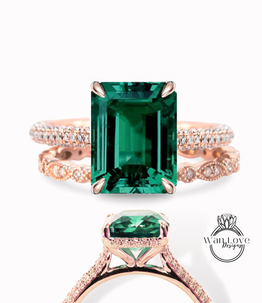 Emerald & Diamond Emerald cut 3 sided Band Celebrity Style Engagement Ring Custom 14k 18k White Yellow Rose Gold Platinum Wedding Anniversary Bridal Gift