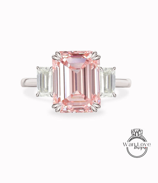 Pink Sapphire & Diamond 3 gem stone Emerald Cut with Tapered Baguettes Engagement Ring 14k 18k White Yellow Rose Gold-Platinum-Custom-Anniversary Gift