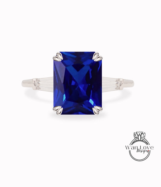 Blue Sapphire & Diamond 3 gem stone Emerald Cut with Tapered Baguettes Engagement Ring 14k 18k White Yellow Rose Gold-Platinum-Custom-Anniversary Gift