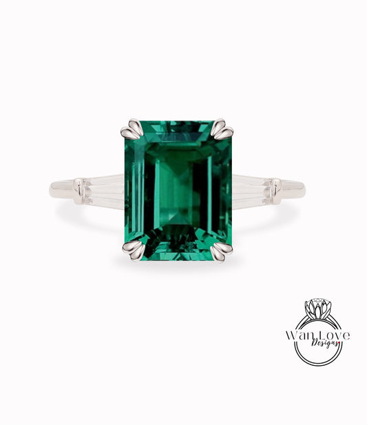 Emerald & Diamond 3 gem stone Emerald Cut with Tapered Baguettes Engagement Ring 14k 18k White Yellow Rose Gold-Platinum-Custom-Anniversary Gift