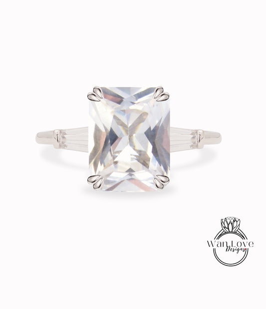 White Sapphire & Diamond 3 gem stone Emerald Cut with Tapered Baguettes Engagement Ring 14k 18k White Yellow Rose Gold-Platinum-Custom-Anniversary Gift