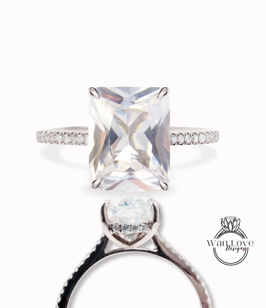 White Sapphire & Diamond Side Halo half halfway eternity Engagement Ring, Emerald cut Pave Rim wedding bridal ring 14kt 18kt Solid Gold Anniversary Gift