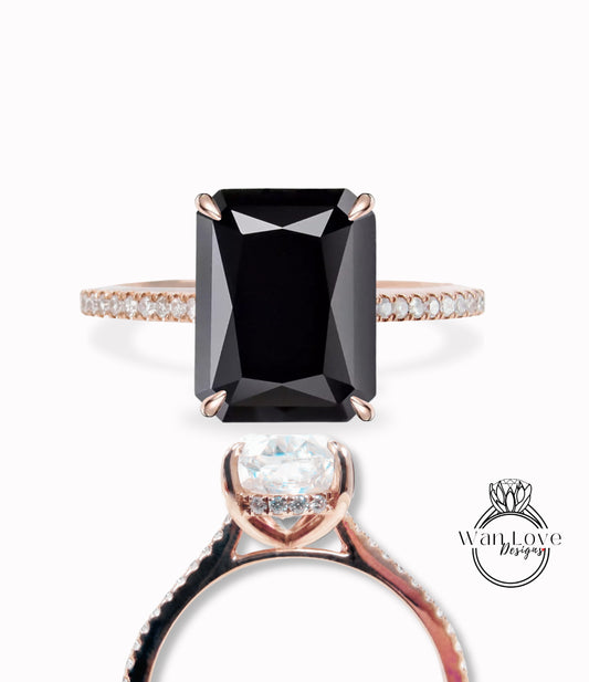 Black Spinel & Diamond Side Halo half halfway eternity Engagement Ring, Emerald cut Pave Rim wedding bridal ring 14kt 18kt Solid Gold Anniversary Gift
