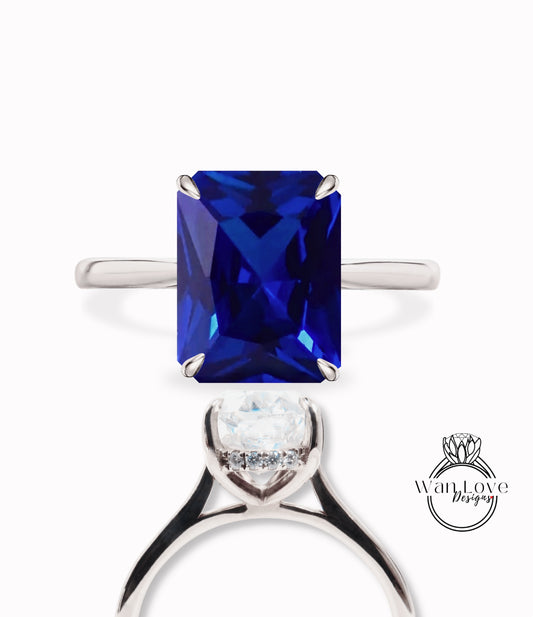 Blue Sapphire & Diamond Side Halo plain tapered band shank Engagement Ring, Emerald cut Dainty Minimalist Pave Rim wedding bridal ring 14kt 18kt Solid Gold Anniversary Gift