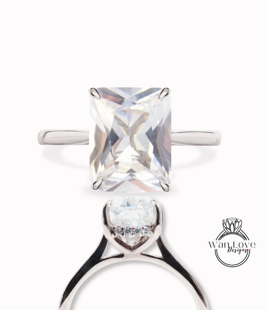 White Sapphire & Diamond Side Halo plain tapered band shank Engagement Ring, Emerald cut Dainty Minimalist Pave Rim wedding bridal ring 14kt 18kt Solid Gold Anniversary Gift