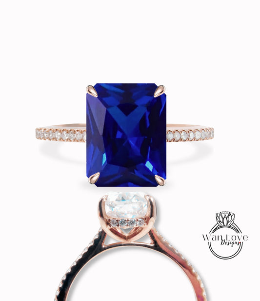 Blue Sapphire & Diamond Side Halo half halfway eternity Engagement Ring, Emerald cut Pave Rim wedding bridal ring 14kt 18kt Solid Gold Anniversary Gift