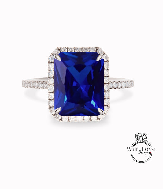 Blue Sapphire & Diamond Emerald Halo Engagement Ring, 14k 18k White Yellow Rose Gold, Platinum, Custom, Wedding,Anniversary Gift