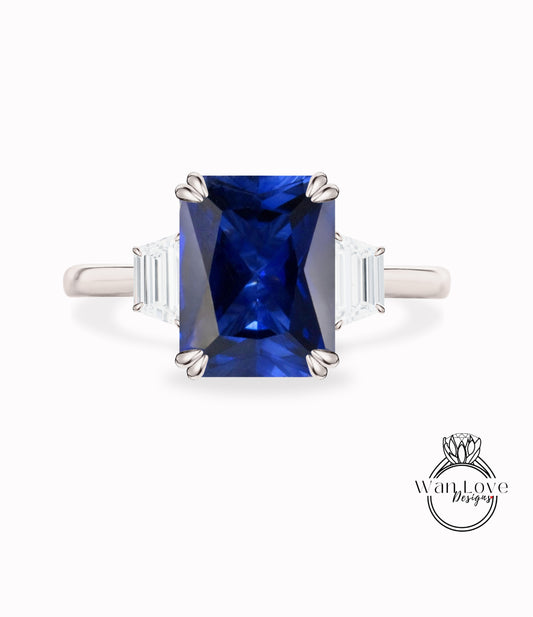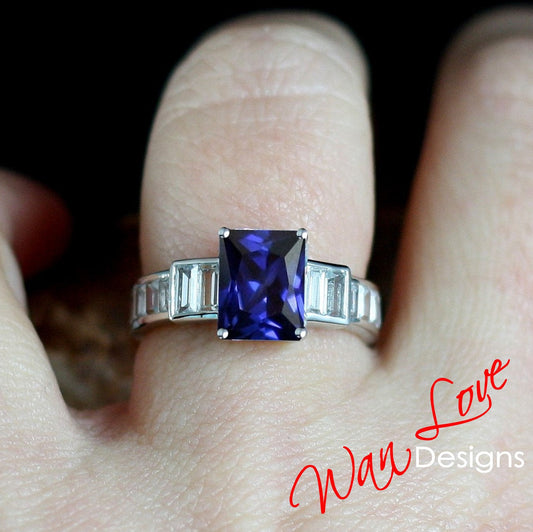 Blue Sapphire Art Deco Moissanite Emerald Baguette Engagement Ring 3ct 9x7mm Custom Wedding Anniversary Gift