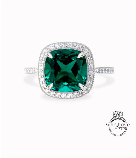 Cushion Cut Emerald Engagement Ring, Diamond/Moissanite Halo Wedding Ring, Half Eternity Diamond Milgrain Custom Ring, 14k/18k Gold Ring