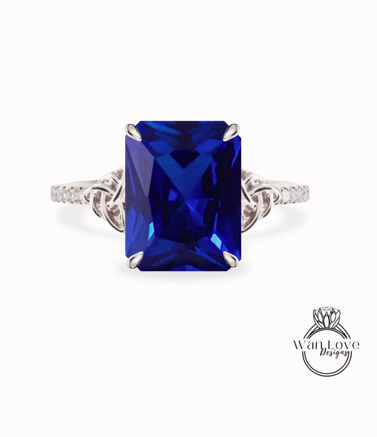 Blue Sapphire & Diamond Emerald Radiant Celtic Knot Engagement Ring Custom, 14k 18 White Yellow Rose Gold,Platinum, Anniversary
