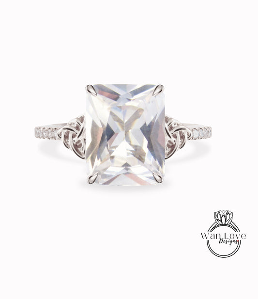 Celtic White Sapphire engagement ring rose gold Emerald cut diamond Celtic knot wedding ring Unique Bridal Promise Anniversary ring gift