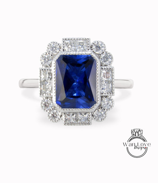 Blue Sapphire Emerald Milgrain Bezel Princess Round Halo Engagement Ring Antique Moissanite Custom Wedding