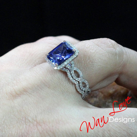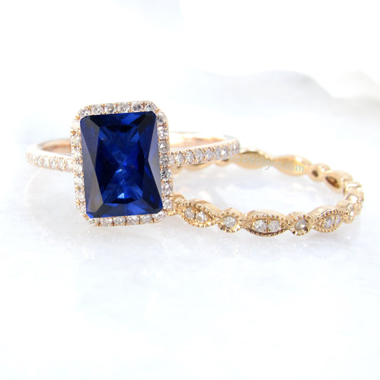 Blue Sapphire & Diamond Emerald Engagement Ring, Wedding Band set, 14k 18k White Yellow Rose Gold-Platinum-Custom-Anniversary