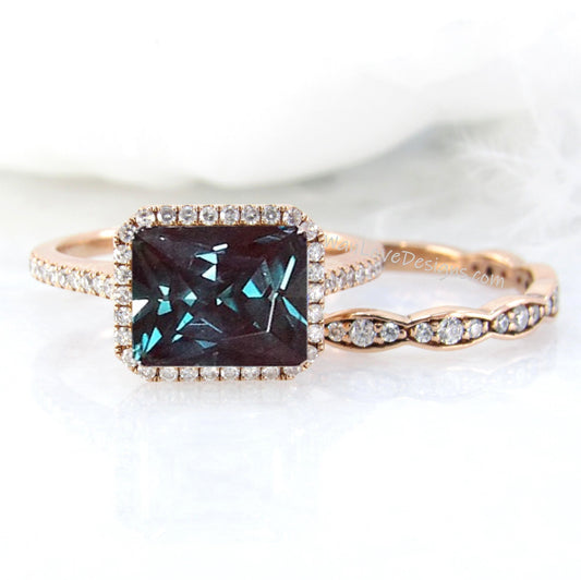East West Alexandrite Engagement Ring set Vintage Ring Emerald cut diamond halo milgrain half eternity Wedding band promise Anniversary ring
