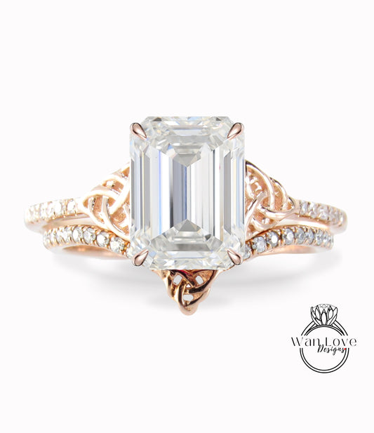 Celtic Moissanite & Diamond Emerald Bridal Engagement Ring Curved V Chevron Wedding Band Set, 14k 18k Platinum, Anniversary Gift