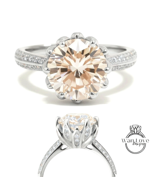 Champagne Moissanite & Diamond Lotus Flower Engagement Round Ring, Cream, Floral, Custom, Wedding,14k 18k White Rose Yellow Gold