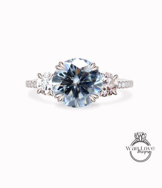 Grey Moissanite & Diamond 3 gemstone engagement Ring Diamond Round Three gem Stone bridal wedding Ring Anniversary Gift