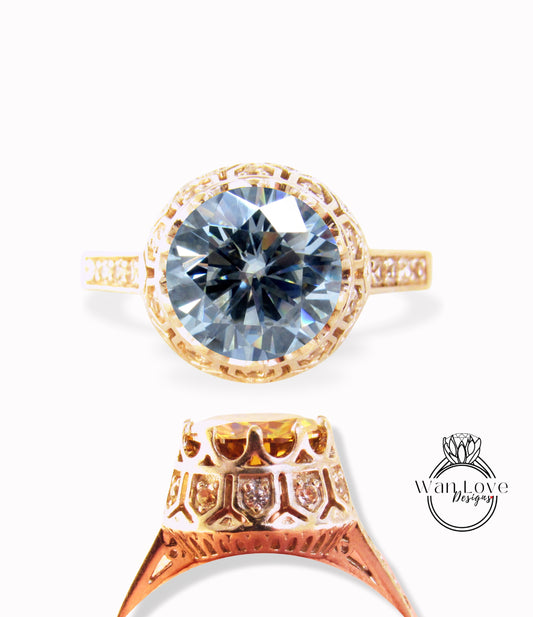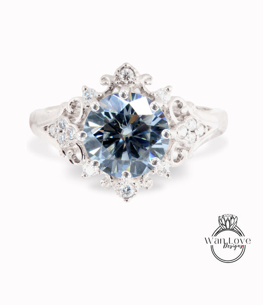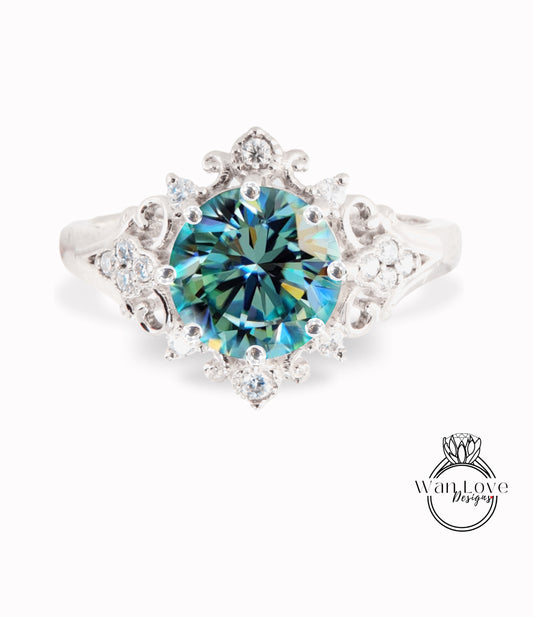 Blue Green Teal Moissanite & Diamonds Ornate Floral Quatrefoil Engagement Ring, Round Antique Custom Vintage Bridal Wedding ring, Anniversary Gift